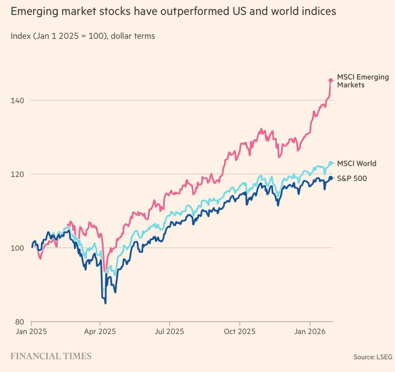 EM currencies have, according to the FT ‘made a roaring start’ in 2026, with Turkey, Brazil, Chile, Mexico, and others gaining 10% in dollar terms in January of this year. Colombia and Korea have performed the best with 20% gain in dollar terms. This is in part due to the weakening dollar, and also surged on with EM stocks outperforming other indices respectively, the US with the S&P 500, and the MSCI World seen below.